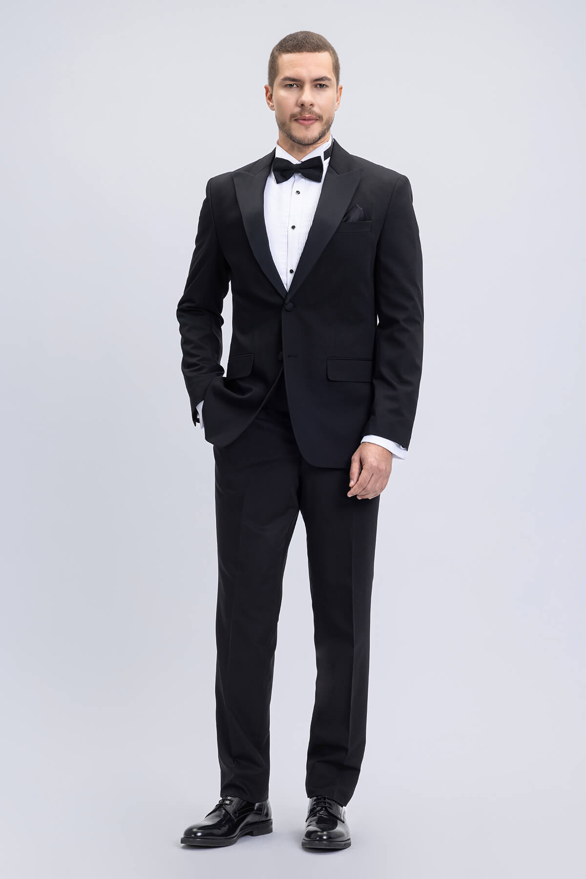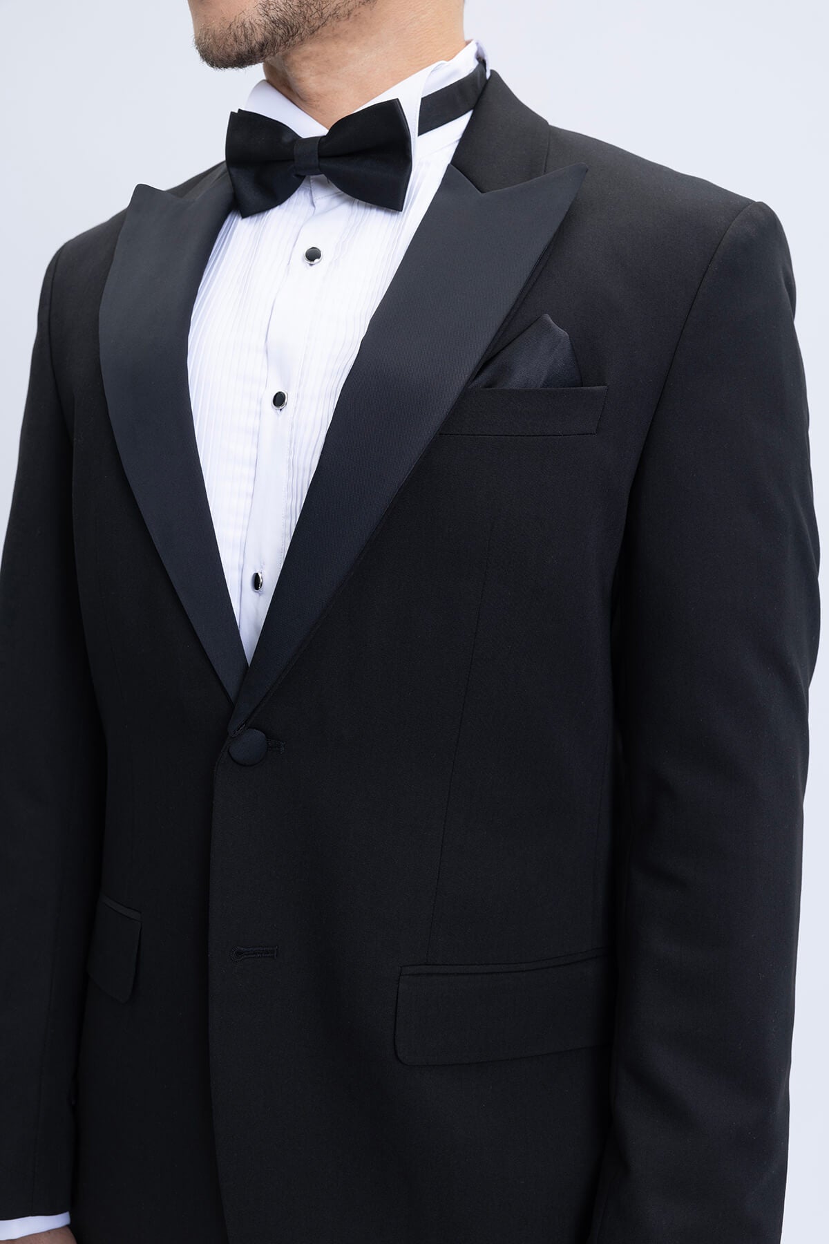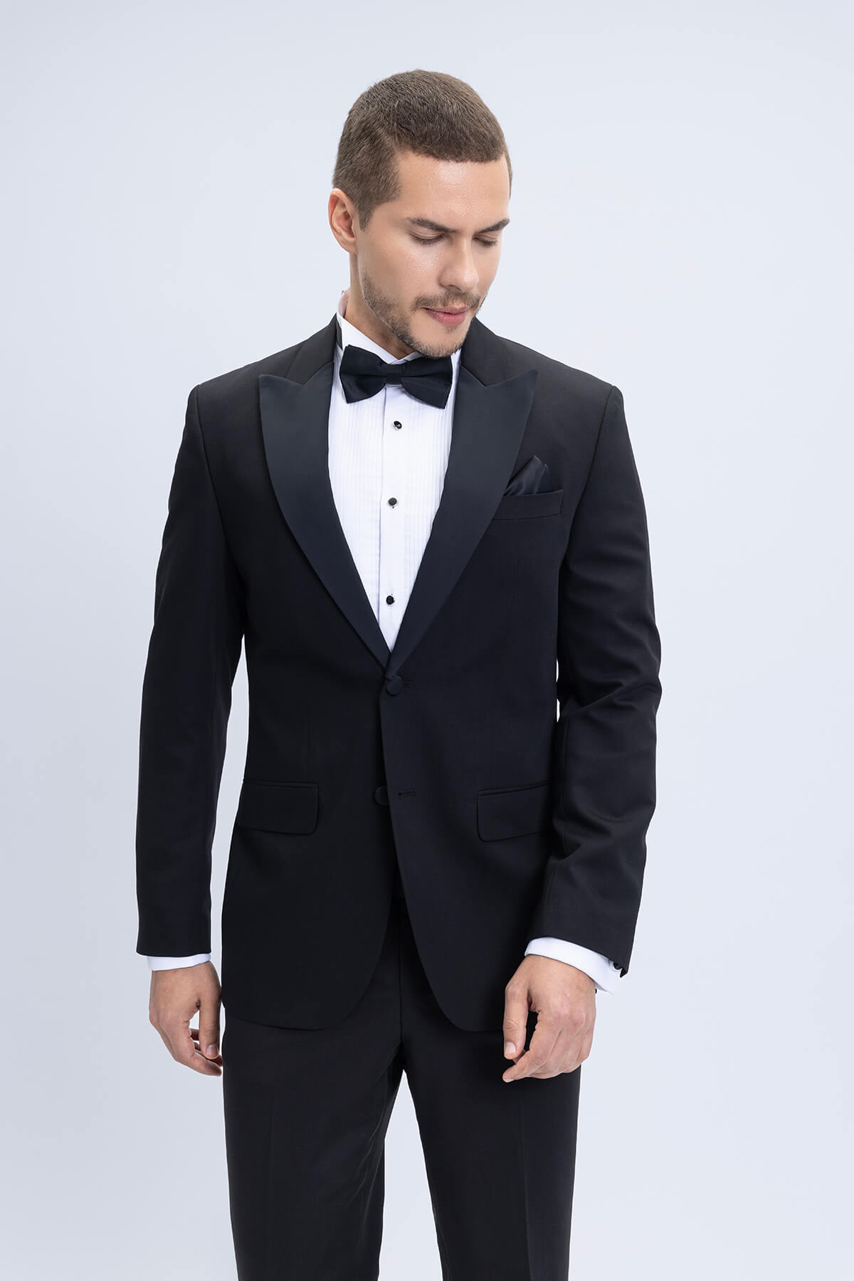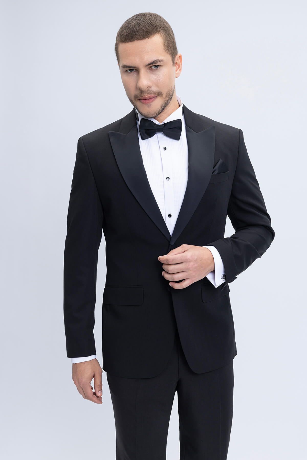 Our black tuxedo collection embodies classic formality with sleek, modern construction. Tailored in rich black wool or stretch-blend fabrics, these tuxedos feature sharp peak or shawl lapels and are ideal for any evening event. Paired with a crisp white shirt and black bow tie, the all-black tuxedo remains a go-to for black-tie affairs, offering both tradition and contemporary masculinity in one perfect ensemble.