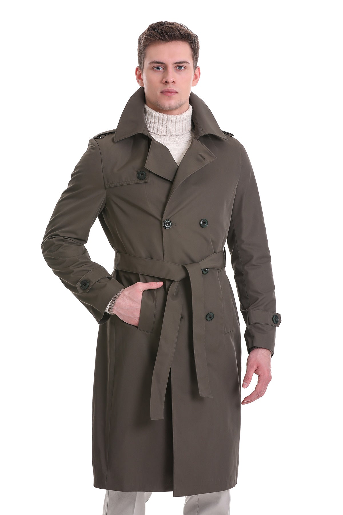 Slim Fit Odesa Flat Collar Khaki Long Coat